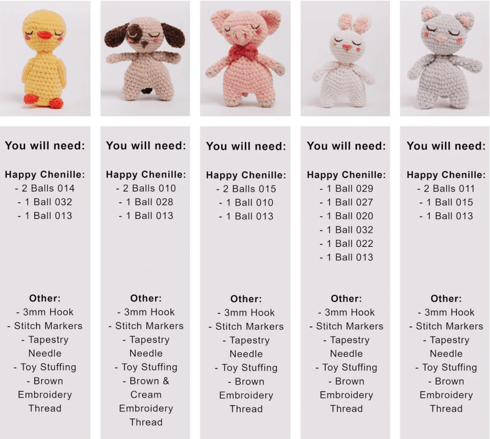 The sweetest pastel shades of velvety soft Happy Chenille are perfect for these plushy little pets. These sleepy baby animals are always cute and won’t make a mess when you’re out.
